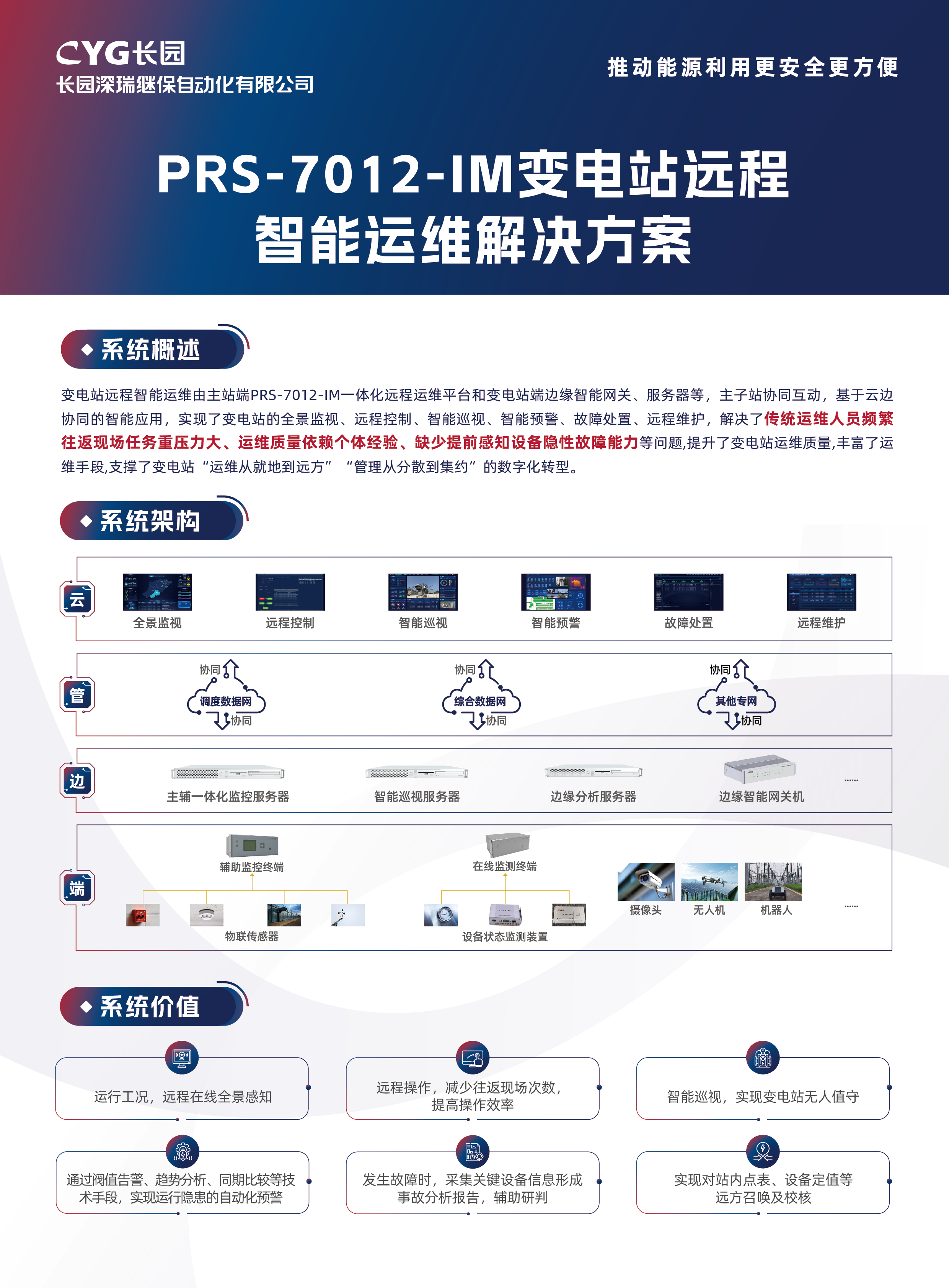 ⻓园深瑞深化智能运维技术⾰新,构建了⼀套“设备外部巡视可观、内部状态可测”的全⽅位智能巡视体系,推出了“主辅全⾯监控、数据深度融合、业务协同互动”的⼤统⼀智慧监控平台,有效⽀撑变电站设备“运维从就地到远⽅”、“管理从分散到集约”的数字化转型,实现变电站的⽆⼈智能巡视;创新应⽤了智能预警及诊断技术,整合故障隐患预警、数智化定位和策略分析等功能模块,实现了装置由“故障检修”、“定期检修”向“状态检修”的智慧转变。